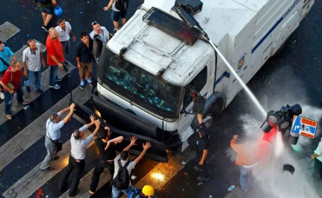 Poliţia turcă a utilizat tunuri cu apă pentru a dispersa miile de manifestanţi care s-au întors sâmbătă în piaţa Taksim din Istanbul, după mai multe zile de calm care au urmat celor trei săptămâni de proteste fără precedent faţă de guvernul de orientare islamistă, a constatat un jurnalist AFP.