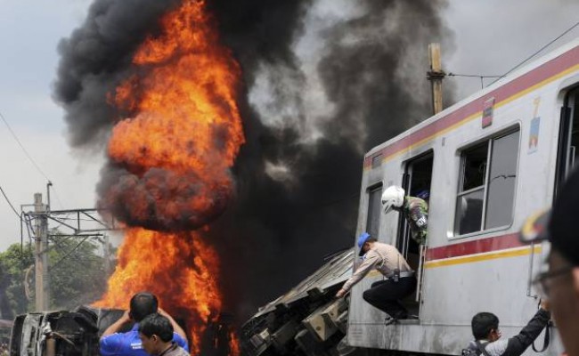Accidentul a avut loc la o trecere la nivel cu calea ferată din Jakarta, trimițând flăcări la peste 20 de metri înălțime și incendiind vagoanele.